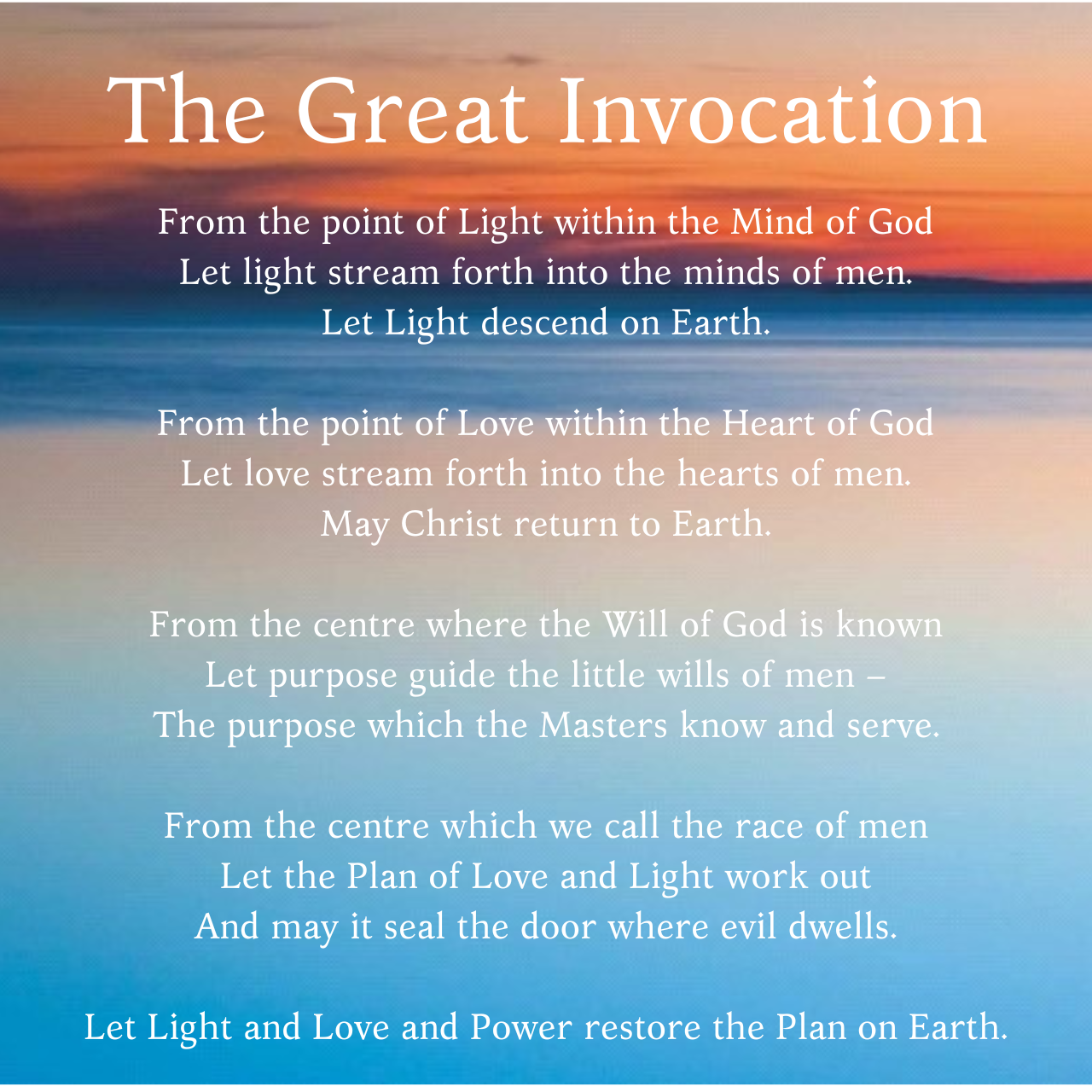 The Great Invocation is a world prayer, translated into over 80 languages and dialects. It is an instrument of power to aid the Plan of God find full expression on Earth. To use it is an act of service to humanity and the Christ. It expresses certain central truths which all people innately and normally accept: